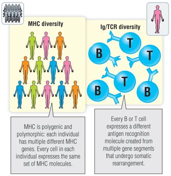 尽管MHC多样性降低了人类种群被新出现的感染消灭的风险,但它在移植中造成了重大问题。正如你将在第34章中看到的,成功的移植需要供者和接受者尽可能具有相似的MHC等位基因。由于MHC的多样性,对于任何可用的随机肾脏,任何患者在所有MHC等位基因上都只有十万分之一的机会相同。