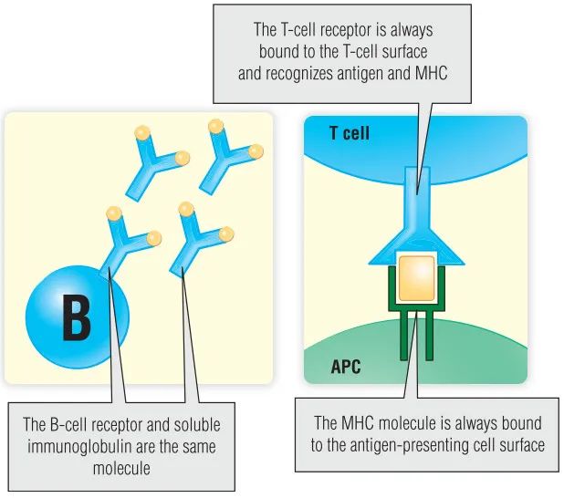 MHC分子的结构将在第8章详细描述,它们的功能将在第10章描述。简而言之,TCR只有在与MHC分子形成复合物时才能识别外来抗原。TCR与外源肽和MHC分子上的残基接触,这是一种不同于B细胞抗原受体的抗原识别,B细胞抗原受体直接与抗原结合。双重识别的要求将TCR分子与BCR分子区分开来。MHC分子的生理功能是捕获并显示来自细胞相关微生物(如宿主细胞中制造的病毒蛋白)的抗原,以供T细胞识别。