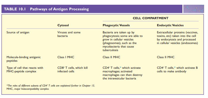 值得注意的是,如Fig 10.2所示,抗原与MHC I类或II类分子结合的可能性完全由其通过细胞转运的途径决定,并非由抗原的某些特殊性质决定。这种抗原处理方式也解释了为什么多糖、脂类和核酸不能被αβ T细胞识别;因为它们没有经过加工处理使其可以结合到MHC分子的结合槽中。