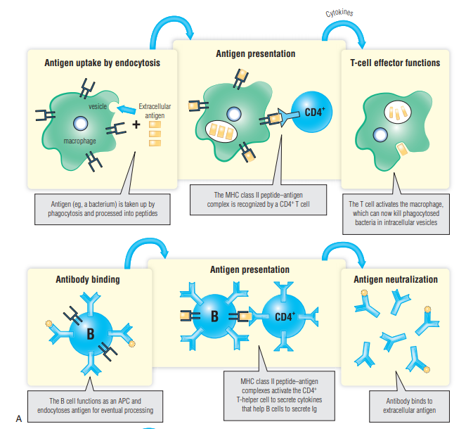 细胞胞浆来源和内体来源的抗原,分别与MHC I类或II类分子相结合,导致不同T细胞亚群的激活(Fig 10.3和TABLE 10.1)。通过MHC II类分子提呈的细胞外抗原可激活CD4+T细胞。CD4+T细胞是辅助性的,例如,CD4+T细胞可通过激活巨噬细胞或刺激B细胞产生抗体来提供帮助(见Fig  10.3A)。在某些情况下,CD4+T细胞为携带抗原的细胞提供帮助。在某些情况下,MHC I类分子/胞内抗原复合物可激活CD8+T细胞,形成可抑制感染的细胞毒性T淋巴细胞。如果不成功,CD8+T细胞将通过诱导细胞凋亡或细胞裂解来杀死靶细胞。