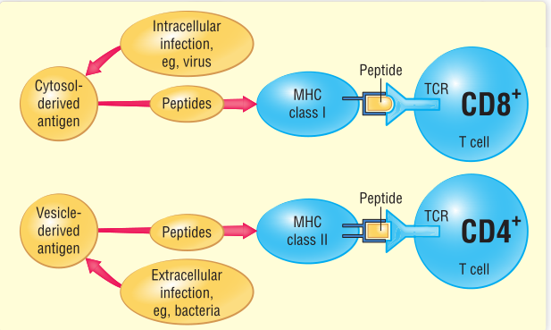 细胞胞质中产生的抗原肽,例如在胞质中复制的病毒和细菌,与I类MHC分子结合,呈递给CD8+T细胞(第7章)。内体中产生的抗原肽是由细胞外抗原(如毒素)的内吞摄取产生的,或由内体捕获的微生物(如巨噬细胞吞噬某些细菌)后产生的,可与II类MHC分子结合,进而呈递给CD4+T细胞。这意味着CD8+T细胞可以监测细胞内环境,而CD4+T细胞可以监测细胞外环境。