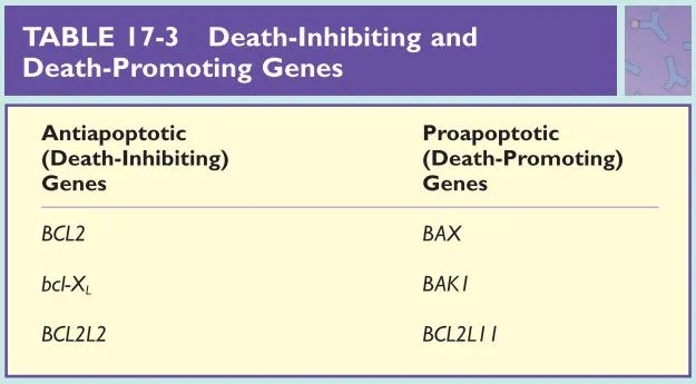 细胞凋亡是清除多余或受损细胞的一种机制。这是一个由濒临死亡的细胞启动的进化保守的过程,它代表了一种受控的细胞破坏形式。目前已经确定了几个促进或抑制细胞凋亡的基因(Table17-3)。抗凋亡基因有一些特征,如比其他基因存活时间更长。Bcl-2是重要的抗凋亡基因。Bcl-2型的抗凋亡基因似乎通过提高细胞的凋亡阈值来发挥作用;即表达Bcl-2蛋白的细胞所需的凋亡启动剂剂量大于没有Bcl-2蛋白的细胞所需的凋亡启动剂剂量。