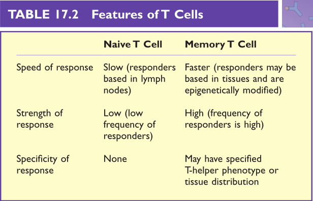 Table 17.2 初始T细胞与记忆T细胞的特征比较