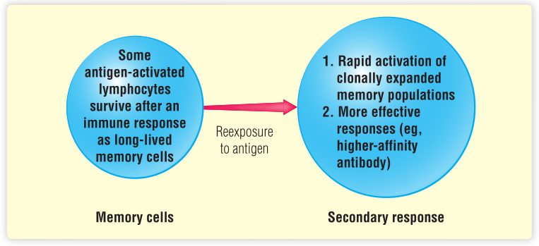 记忆B细胞保留了高亲和力的抗原受体,这种受体是通过连续的体细胞遗传变化而产生的。随后暴露于抗原时,做出反应的是该记忆细胞而不是别的幼稚B细胞。证明这一点的证据来自于观察,在早期接触过病原体(如麻疹病毒)的人再次接触病原体时,会对病原体上的相同表位做出反应,即使新的表位具有抗原性,他们也不会对其做出反应。这一观察结果与第二次及随后的抗原暴露结果一致,即激活了先前存在的记忆细胞,而不是诱导新的幼稚细胞分化。