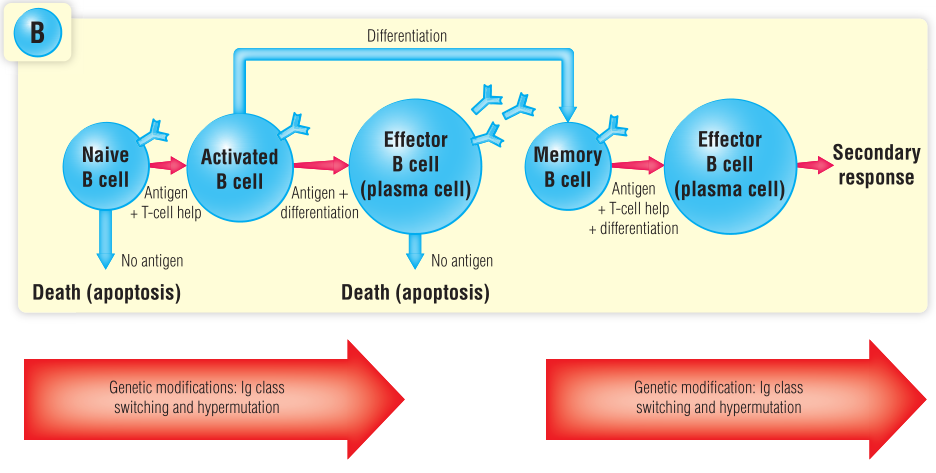 被抗原激活的幼稚B细胞分化为可以分泌抗体的效应B细胞(浆细胞)(第14章)。在初级免疫反应中,浆细胞分泌相对低亲和力的抗体,而在次级免疫反应中分泌亲和力相对较高的抗体。
