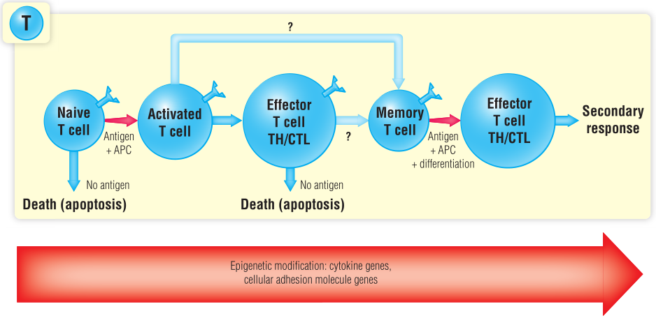记忆T细胞是在应对感染的初次免疫反应过程中产生的。目前尚不清楚它们是在成为效应性T细胞之前由激活的T细胞产生的,还是由效应性T细胞产生的,或者两者兼而有之。在获得记忆表型的过程中,T细胞经历了具有重要作用的表观遗传修饰。在增殖过程中,这些基因表达模式被传递给子代细胞。第16章解释了这些表观遗传修饰是如何获得的。