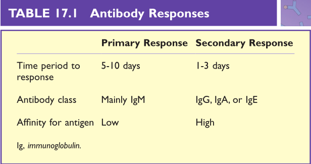 体细胞超突变发生在次级免疫应答过程中,可以促使产生与抗原结合亲和力更高的结合位点(第6章和第14章)。免疫球蛋白(Ig)类别转换可以在初次免疫应答期间发生,但通常初次应答主要是IgM,而再次应答可以是IgG、IgA或IgE(Table 17.1)。