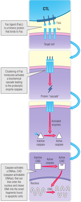 FasL(例如在杀伤T细胞上表达)与Fas(例如在靶细胞上表达)的结合,在靶细胞中触发一系列的细胞内生化反应。Fas与“死亡受体途径”中的几种蛋白质相互作用,最终激活一种被称为caspase的蛋白水解酶,该酶在激活caspase级联中其他的几种蛋白水解酶方面起着关键作用。这种蛋白水解级联在某种程度上类似于细胞激活的激酶级联(第11章)。Caspase级联的关键步骤是激活细胞质酶,caspase可激活DNA酶(CAD),然后它可以迁移到细胞核,将DNA裂解成小片段,引起细胞凋亡(见Table 17.3和第22章)。