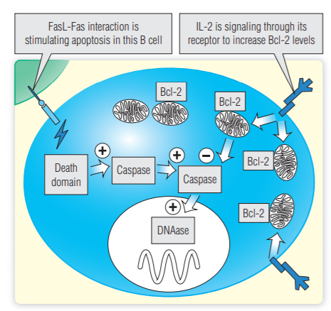 另一个细胞凋亡的早期影响是线粒体的损伤,这会导致线粒体内容物的释放;随后进一步激活半胱氨酸天冬氨酸蛋白酶。Bcl-2是一种抗凋亡蛋白,它结合并稳定线粒体,防止凋亡上调(第17章)。IL-2水平下降会降低Bcl-2在细胞内的浓度,使细胞更容易发生凋亡。这发生在免疫应答成功清除抗原时,抗原水平下降,IL-2分泌减少。