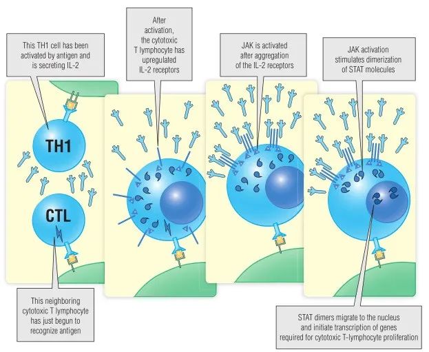 大多数常见的细胞因子受体在完全静止的细胞中不会大量表达,而是在细胞被激活后表达才上调,例如T细胞通过T细胞受体激活,细胞受体表达上调。它们通常分布在细胞表面。当细胞因子与其受体结合时,会导致受体在细胞表面聚集。Janus激酶(JAKs),一种酪氨酸激酶,通常与细胞因子受体的胞浆部分相关,当JAKs散布在细胞时,仍然处于不活跃状态。而当受体通过细胞因子结合在一起时,JAK酶被激活,然后它们共同磷酸化几种信号转导和转录激活因子(STATs)中的一种。一旦STAT分子被磷酸化,它们就会形成二聚体,迁移到细胞核,并激活特定基因的转录。有多种JAK和STAT分子。例如,当IL-2与激活的T细胞表面的受体结合时,它会激活JAK5、STAT1和STAT3。当这些分子迁移到细胞核时,它们会激活启动T细胞增殖的基因。