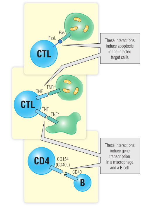 肿瘤坏死因子的作用取决于它结合的靶细胞。如第22章所述,当TNF与受感染的细胞结合时,它通过自身的死亡结构域参与诱导半胱氨酸天冬氨酸酶(caspases)依赖的凋亡。另一方面,当肿瘤坏死因子与巨噬细胞或内皮细胞结合时,它通过与一组能够激活核因子κB(NF-κB)的特殊接头分子结合来诱导基因转录。Fas-FasL结合只诱导靶细胞凋亡,但这种诱导现象很常见。CD40/CD154(CD40配体)结合诱导基因转录,在T细胞与APC或B细胞的通讯中发挥重要作用(Fig 24.3)。第16章讨论了CD154基因突变导致抗体缺陷的现象。