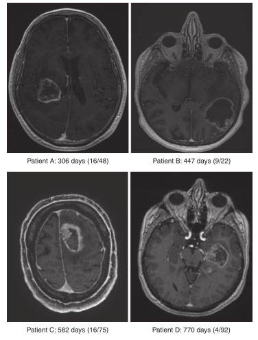 Fig 4.3 对4例胶质瘤患者(WHO分级为4级)进行MRI扫描,以(I)术后数天的存活时间和(Ii)患者TIL所识别的突变表位数(由IFN-γ产生所确定的突变表位数与所识别的突变总数之比)为指标。集中的TIL应答似乎与提高存活率有关,这一观察结果需要在更大规模的研究中进行随访。