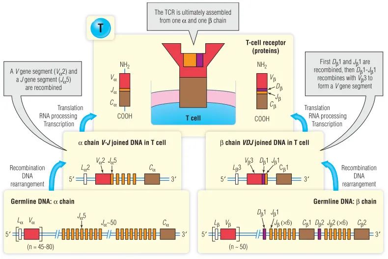 感染性疾病模型的临床前研究可能提供一个关于TCR谱系形成与新表位特异性免疫反应相关的思路。对腹腔感染甲型流感野毒株(HK/PR8)的小鼠脾和支气管肺泡灌洗液中衍生的T细胞的分析表明,动物的CD8 TCRVβ谱系是由一次病毒攻击形成的,能够有效地识别和响应另一种野毒株的二次攻击,而不是其他任何一种病毒的变异版本(HK/PR8-NPN3A)。此外,虽然野生型病毒株的攻击提供了更广泛的TCRVβ库,但病毒的突变毒株诱导了更集中和狭窄的抗原特异性T细胞亚群,具有微妙的TCR重排模式。