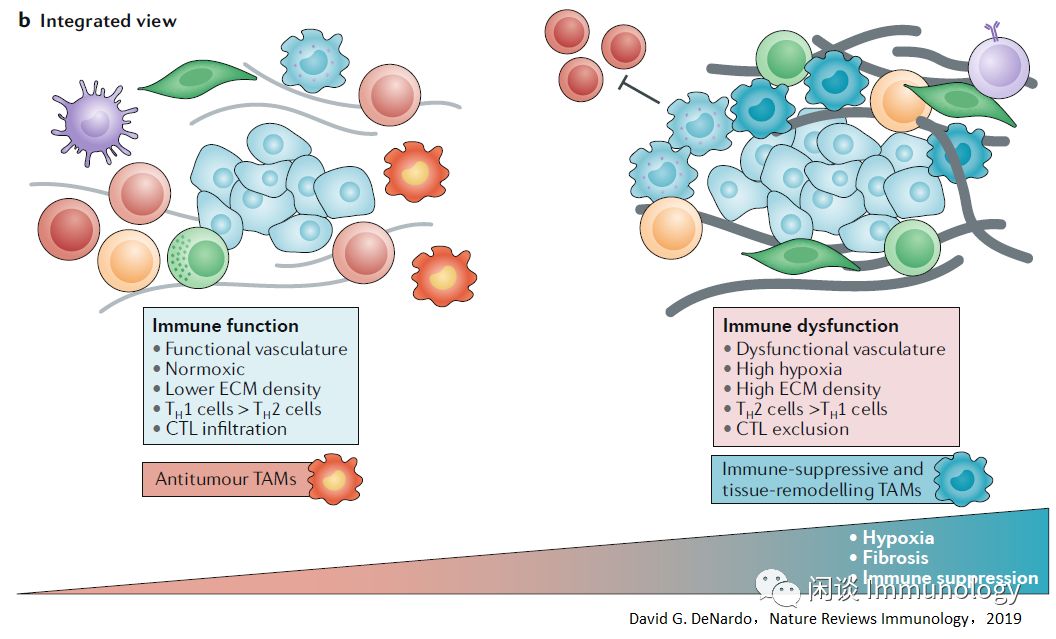下图右侧:肿瘤缺氧,纤维化与大量癌症相关的成纤维细胞(CAFs),免疫抑制细胞浸润集成,以及巨噬细胞被编程以驱动免疫抑制的表型和组织重塑,导致细胞毒性T淋巴细胞(CTL)排除和/或抑制。