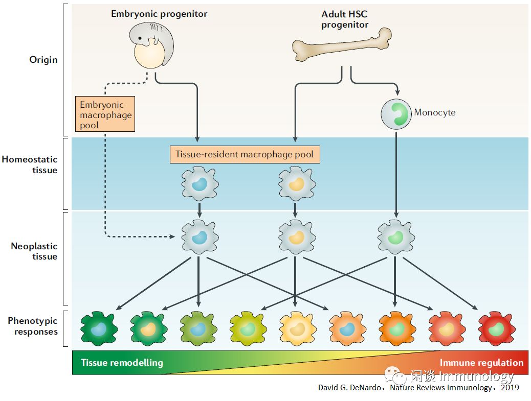 巨噬细胞来源于胚胎或成人造血干细胞(HSC)祖细胞,在稳态条件下,这些群体的相对贡献因组织而异。单核细胞衍生的巨噬细胞,则在炎症性疾病,包括肿瘤,免疫调节中起着重要作用。发育起源,及组织环境是巨噬细胞极化,并参与免疫调节的基础。