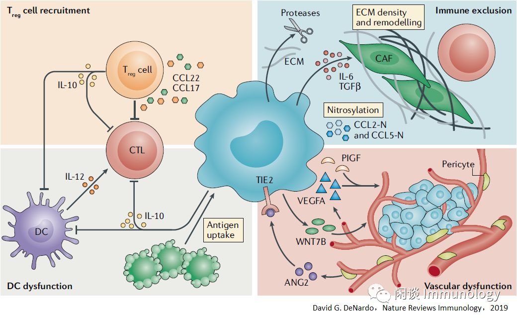 在胶质瘤和乳腺癌模型中,放射、化疗和血管破坏已被证明能增加CXCL12的表达,并促进CXCR4依赖的巨噬细胞的重新生长和抵抗。有趣的是,CXCL12似乎是通过优先招募TIE2巨噬细胞来发挥作用的,TIE2巨噬细胞与血管形成密切相关,对肿瘤血管形成很重要。因此,消耗TIE2巨噬细胞可改善血管破坏,中和ANG2可改善对VEGFA阻断的反应,并抑制TIE2阻断化疗诱导的TIE2 TAM在乳腺模型中的吸收,并导致转移减少。虽然TIE2 TAMs对肿瘤免疫的影响和联合免疫治疗的可能性尚不清楚,但ANG2和VEGFA的双重中和促进T细胞浸润,其疗效完全依赖于CD8T细胞。CXCR4的抑制也使胰腺癌模型对检查点阻断更有反应。