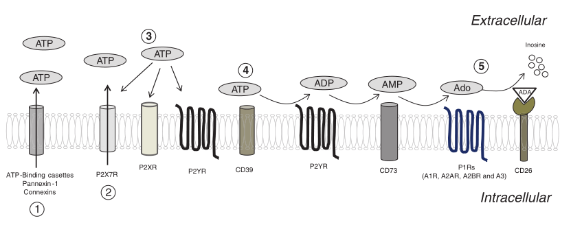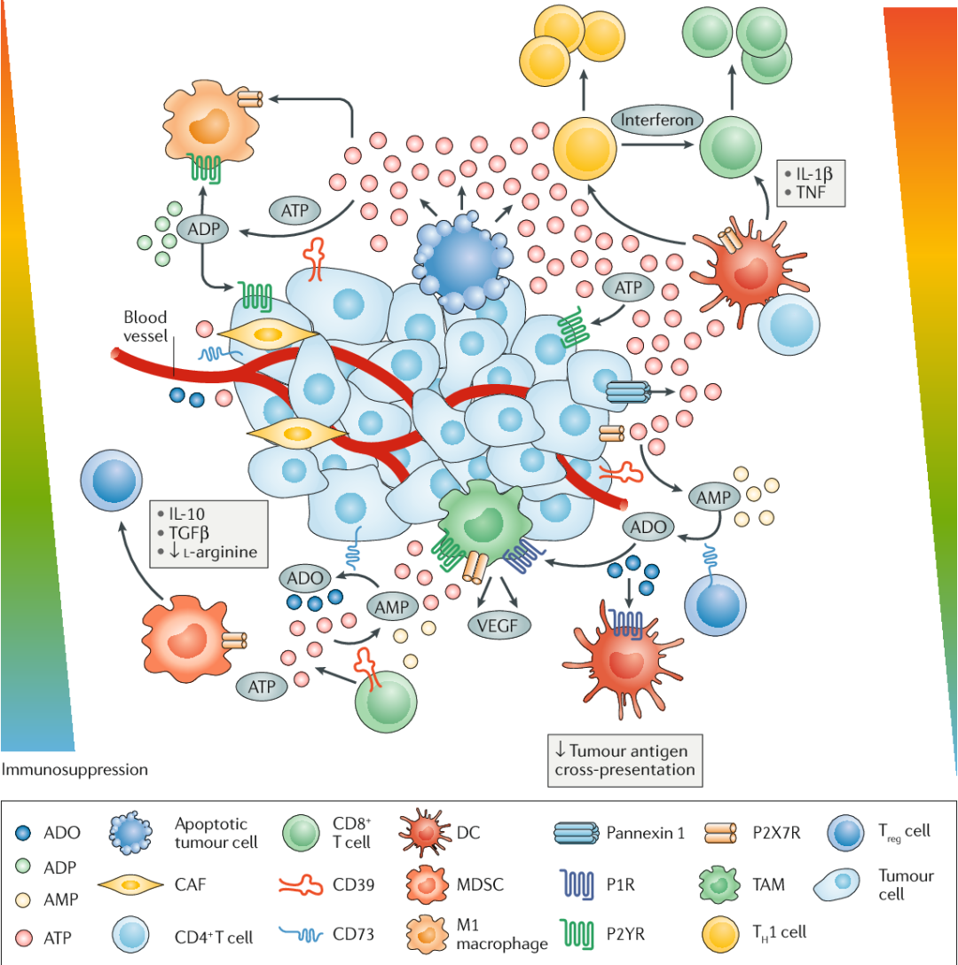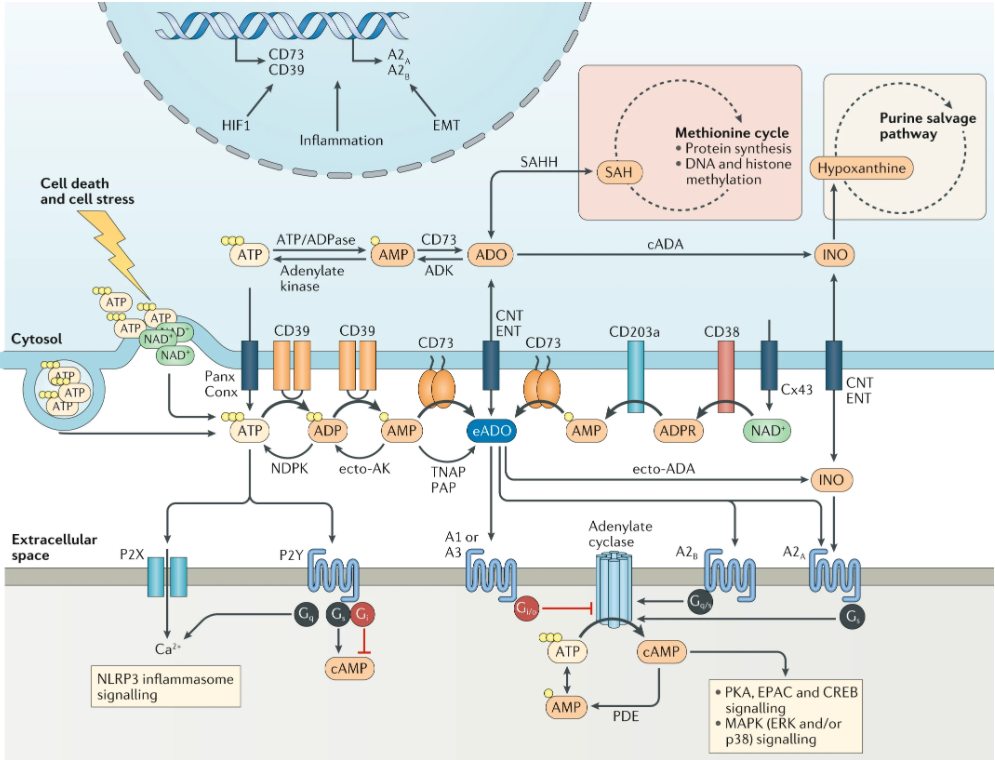 目前,我们知道缺氧肿瘤微环境(TME)在遗传上是不稳定的,并经历不断的代谢重组。这种缺氧环境触发TME中的细胞释放促炎性三磷酸腺苷(ATP),随后被外核苷酸酶(CD39和CD73)去磷酸化为免疫抑制性腺苷。Geoffrey Burnstock的实验有助于证明细胞外ATP和腺苷能够以自分泌/旁分泌方式与质膜上的嘌呤受体结合。1978年,他的团队将嘌呤受体分为两个亚组,一个是选择性ATP/二磷酸腺苷(ADP)受体(称为P2受体),另一个是选择性腺苷受体(称为P1受体)。