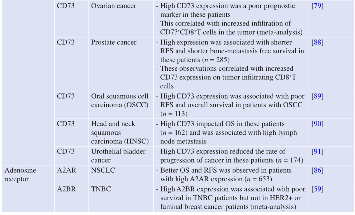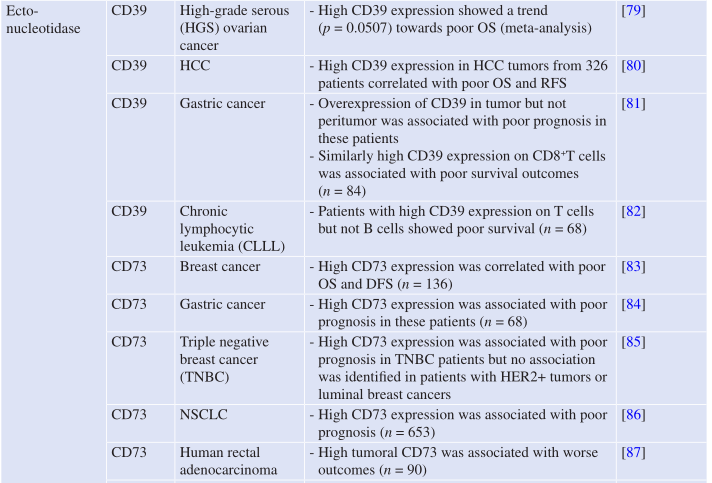 Table 7.1所示,CD39和CD73的共同或差异表达在许多来源于实体和血液的人类癌症中已有报道。越来越多的证据表明,肿瘤细胞上CD39和CD73的表达可促进肿瘤细胞的生长和存活。因此,CD39或CD73高表达的癌症患者在几种癌症类型中表现出较差的生存和无复发生存期的结果也就不足为奇了(Table 7.2)。