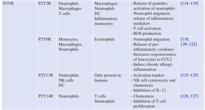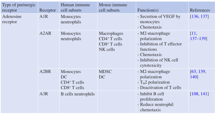 P1R在小鼠和人类的髓系淋巴系免疫细胞中广泛表达(Table 7.3)。在P1受体中,A1R和A2BR的表达更局限于髓系细胞,而A2AR和A3R在髓系和淋巴细胞群体中的表达更为普遍。