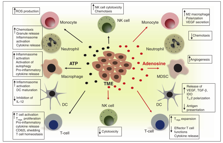 因此,缺氧水平的增加可导致TME中腺苷水平的升高。Busse和Vaupel于1996年首次报告了这一观察结果,发现TME中的腺苷水平与肿瘤质量相关。此后,几项研究证实许多小鼠和人类肿瘤中腺苷水平均有升高。例如,Zhang等人的研究表明,缺氧通过激活信号分子细胞外信号调节激酶(ERK)促使M2型巨噬细胞的发育来促进肿瘤的发展。这导致小鼠肺癌内的血管增加,并促进了小鼠肺癌生长的进程。同样,与周围正常组织相比,在各种人类实体腺癌中,如人类结肠癌(T-84和HT-29)和肺癌(A549)以及小鼠MC38结肠癌中,细胞外腺苷水平也被发现增加了许多倍。