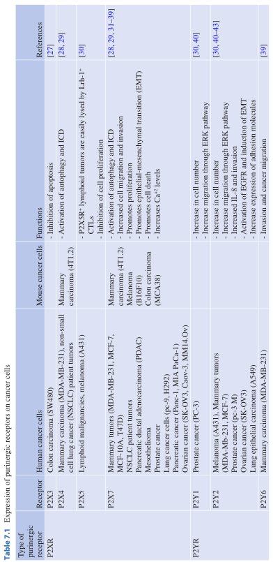 TME中高浓度的ATP可直接影响肿瘤发生过程中P2Rs的表达和功能。这一点通过几种人类和小鼠的肿瘤细胞系的P2R差异表达得到了证实(总结见Table 7.1)。通常,肿瘤细胞上P2XRs的表达与抗肿瘤功能相关(见Table 7.1)。然而,P2X7R对肿瘤细胞的生长和存活的影响似乎有着相反的作用。