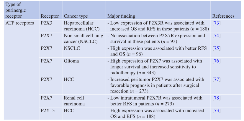 在癌症患者中也发现了这种相反的P2X7R效应,即P2X7R的表达与胶质瘤、非小细胞肺癌(NSCLC)和肝细胞癌(HCC)患者的总体生存率有良好的相关性。然而,肾细胞癌(RCC)患者的情况则相反(Table 7.2)。