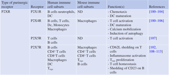P2XRs介导Na+、K+和Ca2+离子跨质膜的转运。因此,推测这些受体不参与抗肿瘤免疫的调节。所以,尽管P2XR和P2YR在同一时间被发现,但P2XRs在免疫调节中的作用直到现在才变得明显起来。各个P2XRs在不同免疫细胞类型上的表达如Table 7.3所示。在已知的P2XRs中,P2X7R在免疫细胞和肿瘤细胞中的表达和功能得到了最全面的研究。Cockcroft和Gomperts首次在大鼠肥大细胞中发现P2X7R的表达。他们最初将P2X7R称为“ATP4− 受体”,因为它与完全解离的ATP(ATP4)结合。1996年,这一“ATP 4− 受体”由Surprenant等人克隆,由于其与其他P2XR的同源性,随后被重新命名为P2X7R。相比之下,P2YRs是G蛋白偶联受体,对ATP/ADP甚至5′-磷酸尿苷(UTP)产生反应,并影响cAMP的激活,cAMP既有促炎功能,也有抗炎功能,与P2XRs类似,P2YRs也在小鼠和人类免疫细胞中表达,P2Y6R亚型的研究比其他亚型更加深入(Table 7.3)。