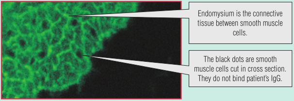 Fig 28.9 乳糜泻患者有抗内膜的自身抗体,内膜是围绕平滑肌纤维束的结缔组织