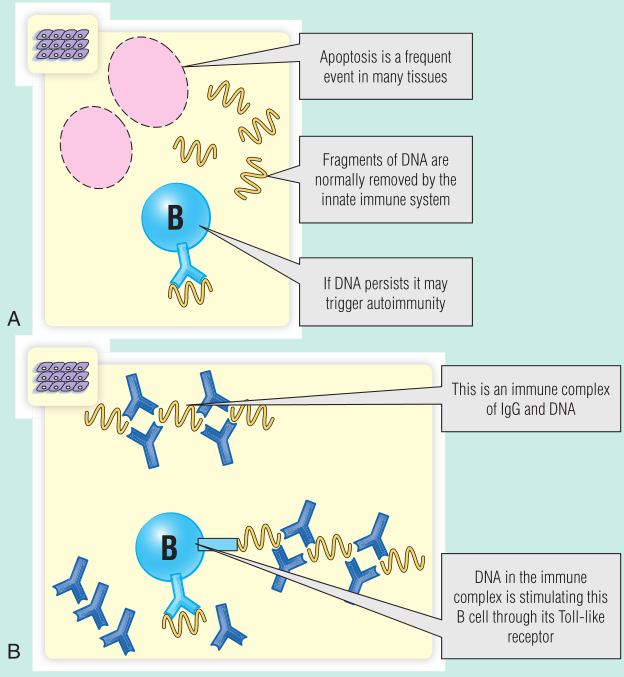 Fig 28.15 A. DNA清除受损最初可能启动抗DNA抗体的产生。B. 然后,含有DNA的免疫复合物可能会刺激Toll样受体,使抗体持续分泌。