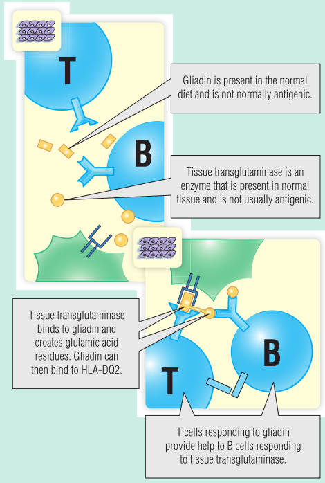 乳糜泻是发达国家小肠疾病最常见的原因,可引起从轻度贫血到严重营养不良的一系列临床问题。乳糜泻是一种自身免疫性疾病,淋巴细胞和巨噬细胞浸润空肠。因此,它是一种针对外源性抗原、一种称为醇溶蛋白的多肽和一种自身抗原tTG的IV型迟发性超敏反应。