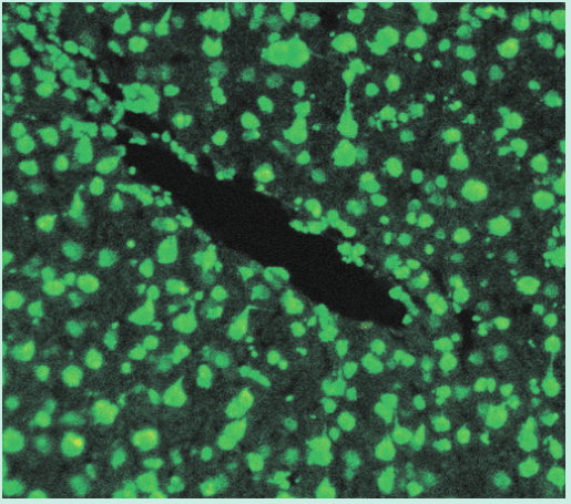 Fig 28.14 间接免疫荧光法检测抗核抗体。一块动物组织被固定在玻片上,病人的免疫球蛋白G与组织中的细胞核结合。
