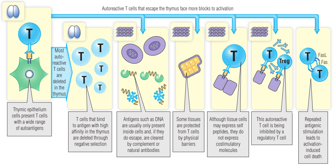 耐受可阻止免疫系统对特定抗原作出反应,第18章对此进行了介绍。中枢和外周耐受期间的检查点经过进化,可以阻止T细胞介导自身免疫。T细胞最初对胸腺中的自身抗原具有耐受性,这是中枢耐受性。胸腺中任何与自身肽高亲和力结合的T细胞都将通过阴性选择被清除,这一过程被称为中枢免疫耐受。
