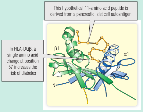 如果一对同卵双胞胎中的一个患上T1DM,另一个有50%的几率也会患上,这就是所谓的符合率。最重要的遗传因素是人类白细胞抗原(HLA)型,它提供了大约90%的遗传风险。在白人中,T1DM经常发生在遗传HLA等位基因DQ2的人中。在大多数人类白细胞抗原-DQ等位基因中,β链的57位被天冬氨酸残基占据。而在HLA-DQ2中,这个位置被另一个氨基酸残基取代。Fig 28.7展示了人类白细胞抗原-DQ2的β链上的这种单一氨基酸残基的变化对于发生T1DM的风险有何影响:57位的非天冬氨酸残基阻止自体肽落在凹槽中,因此自体肽不能被提呈,所以胸腺中不能清除针对自体肽的特异性T细胞。