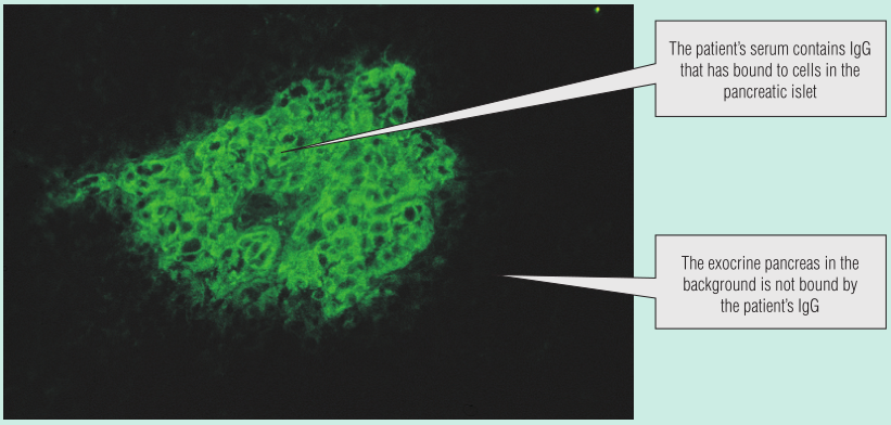 这名男孩的空腹血糖中度升高,但在他的尿液中没有发现酮类物质,这些发现不能诊断为糖尿病。他的血清通过间接免疫荧光检测自身抗体,显示含有胰岛细胞抗体(Fig 28.6),表明可能为T1DM。他开始服用胰岛素,5年后,没有发生糖尿病并发症。