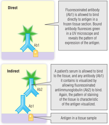 自身免疫性疾病的检测依赖于自身抗体的检测。第5章介绍了抗体特异性检测的两种主要类型。第一种是直接免疫荧光,用来寻找组织中自身免疫过程的证据。这仅在可接触的组织中是可行的,如BOX 28.3中描述的示例中的皮肤。Fig 28.5简要回顾了直接免疫荧光技术。
