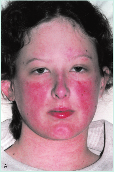 Fig 28.12 A 这名妇女有典型的系统性红斑狼疮面部皮疹。B, 她脚趾上的损伤反映了潜在的血管炎症。