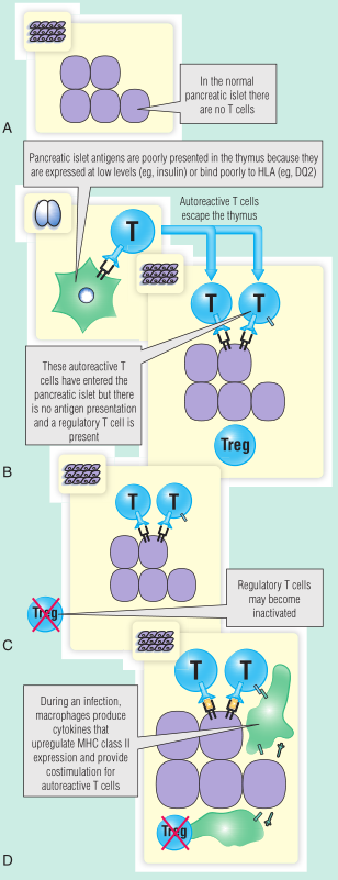 Fig 28.8 胰岛素依赖型糖尿病的发病机制。A,正常胰岛不存在自身反应性T细胞。B,允许自身反应性T细胞逃离胸腺的遗传因素是众所周知的。C,调节性T细胞在1型糖尿病中的确切意义尚不清楚。D,感染在增加主要组织相容性(MHC)的表达中起作用。HLA,人类白细胞抗原;T-reg,T-调节细胞。