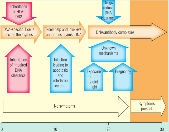 在许多健康的个体中,ANCA的水平都很低。已知ANCA水平可在SLE症状出现前几年升高。此外,针对双链DNA的特异性抗体也会开始产生。目前,将患者从无症状的SLE转变为有症状的SLE的因素还没有完全研究清楚,但可能包括感染、暴露于紫外线和雌激素等。