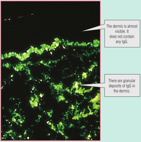 Fig 28.13 新鲜皮肤活检切片与带有荧光标记的抗人免疫球蛋白G(IgG)孵育。当在紫外光显微镜下观察时,组织中的IgG会产生绿色荧光。这些是如何形成的将在第30章讨论。