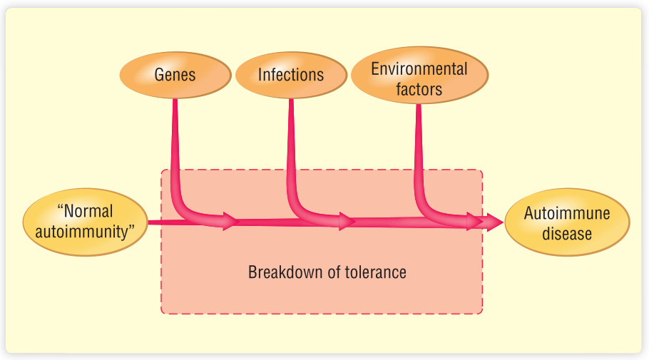 自身免疫性疾病往往在家族中传播。具有相同的自身免疫遗传倾向的个体(例如同卵双胞胎)并不总是患上同样的自身免疫性疾病,如果他们患上了自身免疫性疾病,他们可能会在不同的时间发生。这表明,自身免疫性疾病的发生既受遗传因素影响,也受环境因素干扰。至于过敏,很可能需要几个环境触发因素按顺序诱发才能发展成疾病。这种复杂性就解释了为什么很难阐明自身免疫性疾病的发病机制(Fig 28.3)。如第35章所述,产生恶性肿瘤需要类似的“多发”机制,即遗传因素和环境因素的组合。