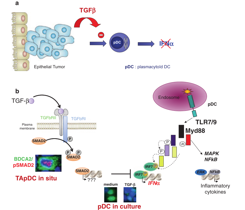 Fig 8.2 TApDC通过TGF-β抑制IFN-Ⅰ的产生。(A)乳腺和卵巢肿瘤环境中产生的TGF-β能有效抑制pDC产生I型IFN。(B)原位TApDC表达核磷酸化的Smad2,证实其表达TGF-β,并导致阻断irf7的核转位。