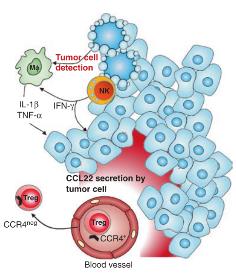 Fig 8.3 IFN-γ、TNF-α和IL-1β由NK和MΦ分泌,转化细胞分泌CCL22,在乳腺肿瘤中吸引CCR4+Treg。健康乳腺上皮细胞在腺泡内以极化的方式分泌低水平的CCL22,它们的转化通过浸润NK细胞导致干扰素γ的分泌而有利于它们的识别。IFN-γ可促进MΦ活化,与乳腺上皮肿瘤细胞相互作用后可分泌TNF-α和IL-1β。IFN-γ、IL-1β和TNF-α的联合作用将诱导肿瘤细胞CCL22的非极化分泌,从而诱导CCR4+Treg从外周募集,导致CCR4内化。