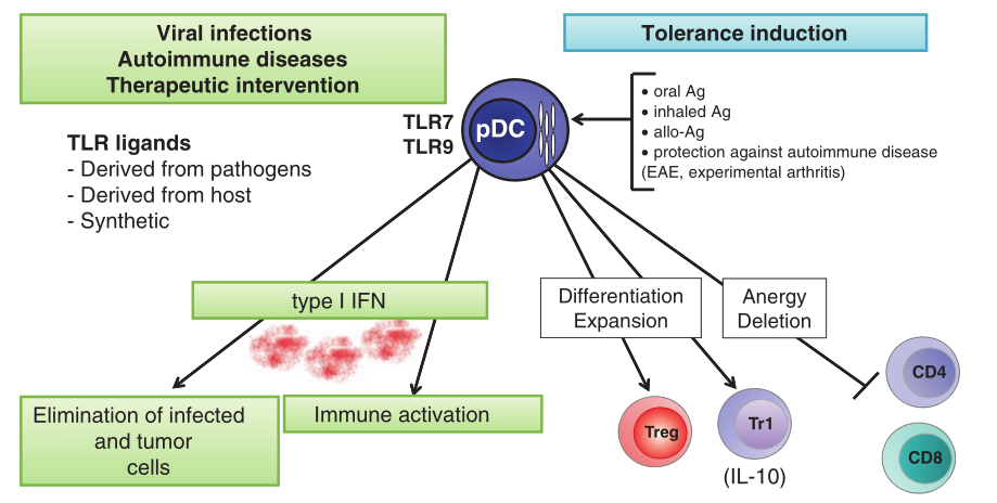 Fig 8.1 pDC可塑性。在病毒感染和发生某些自身免疫性疾病(狼疮、银屑病)期间,pDC通过与病毒或内源性核酸结合TLR-7/9而促进免疫应答,导致其表型的成熟以及产生IFN-I。然而,在其他情况下,如气道或口服抗原递送,在没有TLR-7/9参与的情况下,pDC也可以通过促进Treg的分化和扩增来促进外周耐受。