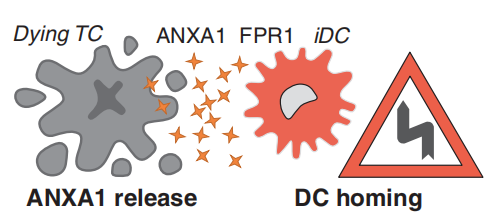 ANXA1可与甲酰肽受体-1(FPR1)结合,FPR1是一种主要由髓系细胞表达的七次跨膜G蛋白偶联受体。在宿主免疫系统中敲除FPR1(以及将FPR1缺陷的造血干细胞转移到FPR1含量正常且被辐射的宿主中)导致宿主无法对濒死的癌细胞产生抗癌免疫反应。