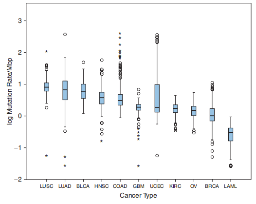 Fig.13.4 不同原发肿瘤类型的突变负荷;(LUSC肺鳞状细胞癌、LUAD肺腺癌、BLCA膀胱尿路上皮癌、hNSC头颈部鳞状细胞癌、COAD结肠腺癌、GBM胶质母细胞瘤、UCEC子宫体子宫内膜癌、KIRC肾透明细胞癌、卵巢浆液性囊腺癌、BRCA乳腺浸润性癌、LAML急性髓系白血病)
