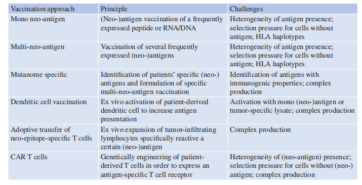 Table 13.1列举了目前肿瘤疫苗开发的一些方式:包括主动接种,即接种主动免疫细胞,如树突状细胞、CAR T细胞或新抗原表位特异性T细胞,或使用多肽进行被动免疫,或使用针对一个或多个肿瘤特异性表位的RNA/DNA(Table 13.1)。