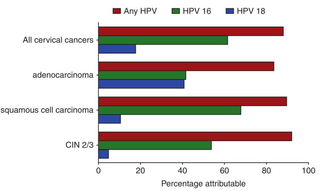 宫颈鳞癌、其他肛门生殖道癌和头颈癌的发生是在持续感染致癌性HPV的情况下发生的。事实上,所有宫颈鳞状细胞癌(SCCx)及其前驱病变–高度鳞状上皮内病变/宫颈上皮内瘤变2/3 (HGSIL/CIN2/CIN3)都是由HPV引起的,最常见的是HPV 16(Fig. 15.3)。大多数宫颈癌都与HPV 16和18型有关。