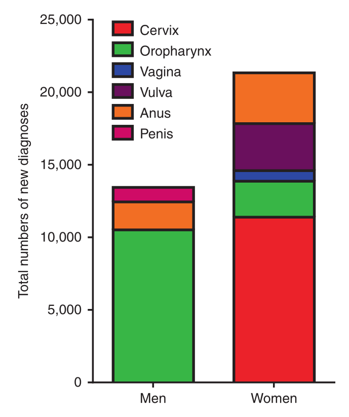 在全球范围内,大约六分之一的新的癌症诊断可归因于一种特定的感染病原体(Fig. 15.1)。人类乳头瘤病毒(HPV)导致了大约30%癌症相关的感染,包括宫颈癌、阴道癌、外阴癌、肛门癌和口咽癌,占全球所有癌症的近5%。在女性群体中,大多数HPV诱发的癌症是宫颈癌;在男性群体中,大多数HPV相关的恶性肿瘤是口咽癌(Fig. 15.2)。尽管有预防性的HPV疫苗以及检测下生殖道中HPV的筛查方法,但在资源匮乏的环境中,宫颈癌是女性因癌症死亡的第二大常见原因。