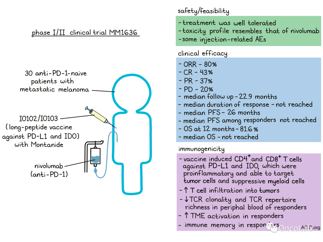 在MM1636试验中,对30名尚未接受抗PD-1治疗的转移性黑色素瘤患者进行了IDO/PD-L1长肽疫苗(IO102/IO103)联合佐剂Montanide的治疗。前6剂每隔一周给药一次,之后每隔四周给药。患者接受了3至15剂不等的治疗,平均为10.5剂。在疫苗接种期间,nivolumab每隔一周同时给药,疫苗接种后每隔四周给药。截止数据统计时间,仍有几名患者在继续治疗。
