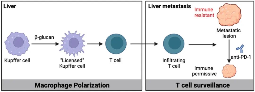 尽管巨噬细胞已被报道参与癌细胞的扩散、免疫逃逸和转移性生长,但也有研究表明巨噬细胞能协同肿瘤特异性免疫应答。因此,我们假设可以通过诱导巨噬细胞的极化来阻止转移。在此,我们展示了经β-葡聚糖(odetiglucan)处理后的巨噬细胞能抑制肝转移。β-葡聚糖能激活肝脏驻留的巨噬细胞(库普弗细胞),抑制癌细胞增殖,并在胰腺癌小鼠模型中引发针对肝转移的有益的T细胞介导反应。尽管库普弗细胞在转移性病变中被排除,但它们对β-葡聚糖的抗转移活动至关重要,这也依赖于T细胞。此外,β-葡聚糖在小鼠和人类肝转移中促进T细胞活化和巨噬细胞重新极化,并使转移性病变对抗PD1疗法敏感。这些发现突显了巨噬细胞功能在转移中的重要性,并将库普弗细胞确定为针对胰腺癌向肝脏转移的潜在治疗靶点。